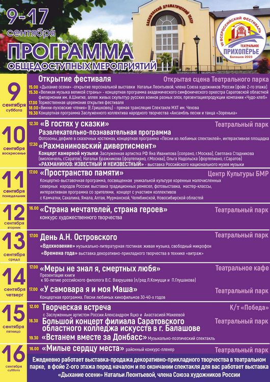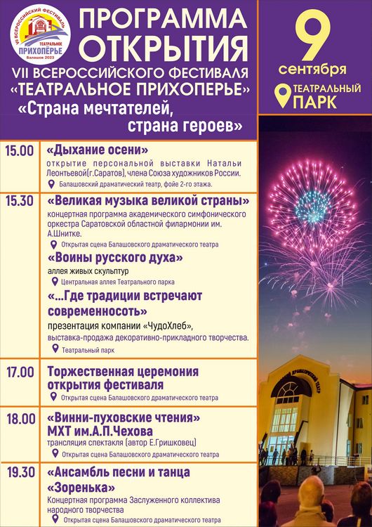 Второй фестивальный день, 10 сентября, начался со спектакля гостевой программы «Али-Баба и сорок разбойников» в исполнении артистов Государственного Академического Центрального театра кукол им. С.В.Образцова. Этот прославленный театр приехал в Балашов в качестве гостя в первый раз, что является одним из самых знаменательных событий фестиваля «Театральное Прихоперье-2023»! Юные зрители на двух показах в 11.00 и 14.00 […]