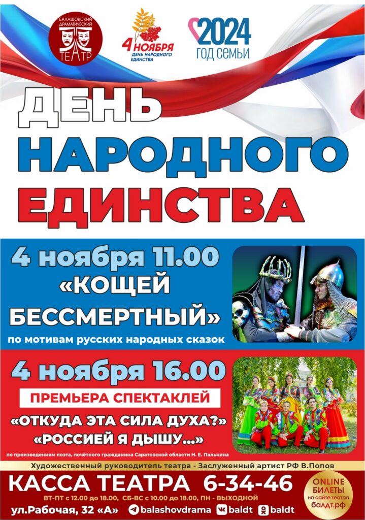 Уважаемые зрители! Балашовский драматический театр в День народного единства приглашает вас и ваших детей в 11.00 посмотреть великолепную, героическую сказку «Кощей Бессмертный», цель создания которой состояла в том, чтобы наши дети могли почувствовать, что их Родина достойна любви, защиты и гордости. Это одна из самых важных тем в творчестве театра, которая, конечно, важна для всех наших граждан вне зависимости от возраста. Поэтому не оставляйте ребят одних в зрительном зале, ведь вы тоже не пожалеете о потраченном времени, посмотрев эту замечательную сказку!
